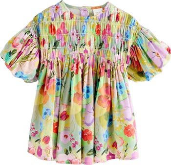 Watch them dance and play in this vividly printed dress framed by charming puff sleeves.