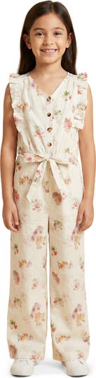 A matching tie adds to the charm of a cotton jumpsuit patterned in ditsy blooms and framed by fluttery sleeves for sweet style points.