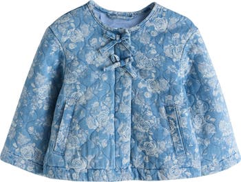 Sweet blooms and tiny ties add to the adorable factor of a quilted denim jacket your little one will love.