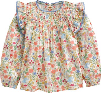 Your kiddo will look oh-so-cute in this whimiscal fairy-patterned top with a smocked yoke and fluttery ruffles.