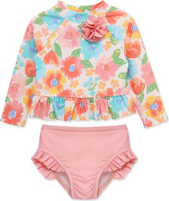 They'll look precious as they splash and play in this ruffled two-piece swimsuit featuring a floral rashguard top and coordinating bottoms.