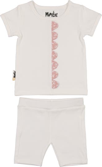 Charming scallop details decorate the front of a playful short-sleeve shirt paired with matching pull-on shorts.