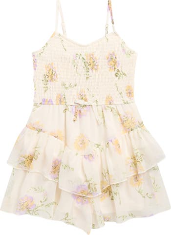 They'll love to twirl in this floaty romper featuring a tiered chiffon overlay and a smocked bodice.