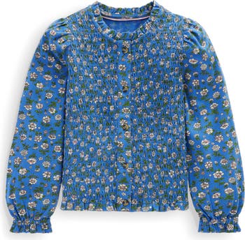 A soft cotton knit keeps your child cozy in a button-up floral shirt fashioned with a smocked front and sweet ruffles at the neck and cuffs.