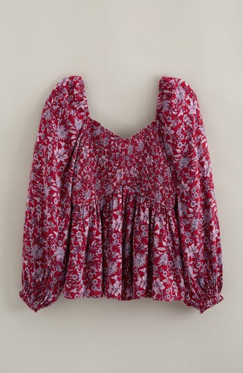 A smocked Empire waist shapes a sweet floral top that's framed by blouson sleeves and a fluttery peplum.