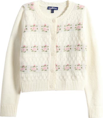 Rows of pastel blooms wrap a lightweight pointelle cardigan finished with a dainty scalloped collar and placket.