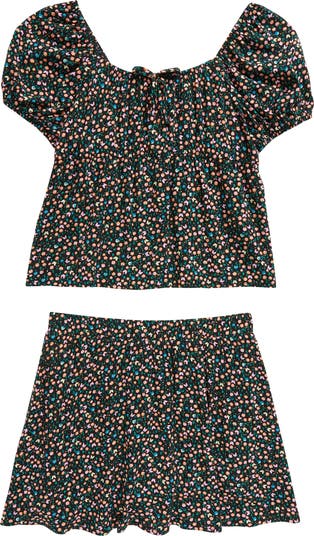 Mini meadow blooms cover a flouncy lightweight top with puff sleeves that's paired with a matching skirt in this carefree and comfortable ensemble.