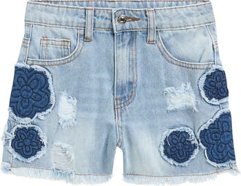 Quilted flower patches add old-school DIY flair to these cutoff shorts with carefully placed distressing and long-loved-look to the faded wash.