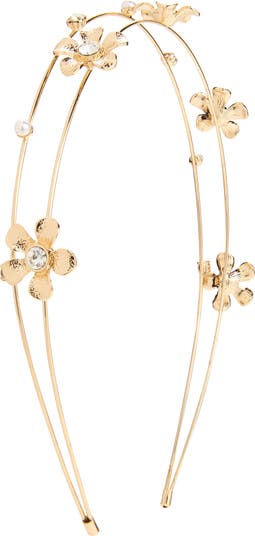 Double bands stationed with pearly beads and crystal-centered flowers bring rich shine to this layered headband.