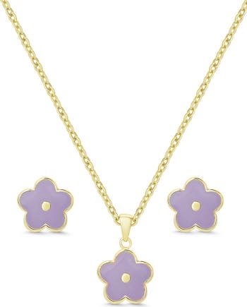 Add an extra pop of color to your kiddo's ensemble with this pretty flower stud earrings and matching necklace set.