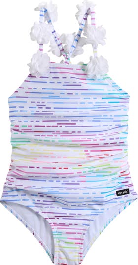 Watch them shine their brightest as they splash and play in this one-piece swimsuit with 3D flowers that flutter with the wind.