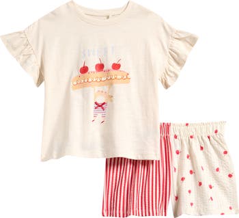 Keep them looking their sweetest in this all-cotton set featuring a graphic T-shirt framed by flutter sleeves and coordinating shorts made of airy seersucker.