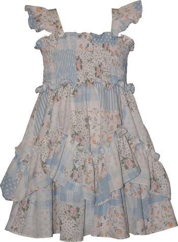 Fluttery ruffles and a playful patchwork print keep your young party goer looking their most precious as they move in this party dress featuring a smocked bodice.