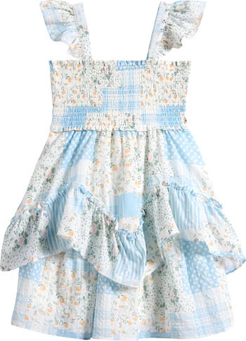 Fluttery ruffles and a playful patchwork print keep your young party goer looking their most precious as they move in this party dress featuring a smocked bodice.