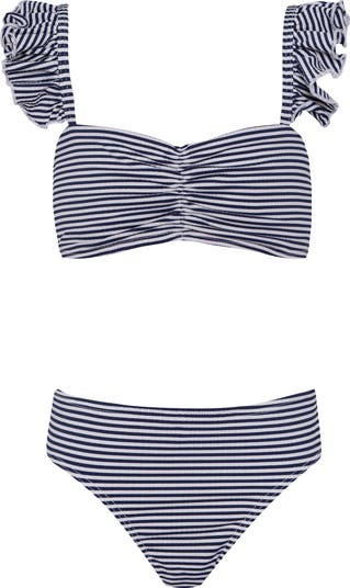 Fluttered straps bring playful energy to this striped two-piece swimsuit that'll keep them splashing happily all day long.