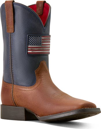 Patriotic spirit meets premium full-grain leather on this western boot topped with a metallic flag patch at the shaft. Breathable mesh lining and a removable comfort insole helps your mini buckaroo keep the pace from the playground to the pasture.