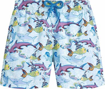 The young man's version of these printed swim shorts is fast-drying and folds into the back pocket. Crafted from lightweight recycled polyester and featuring an elastic waistband