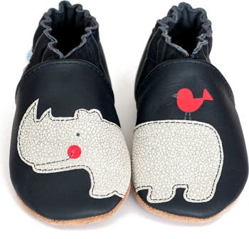 A soft suede sole mimics barefoot walking in this supple leather crib shoe designed for healthy foot development and topped with animal appliqués for added cuteness.
