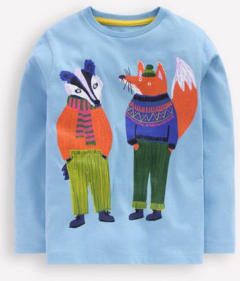 A handsomely attired badger and fox compare style notes from both sides of this long-sleeve T-shirt made from soft cotton jersey.