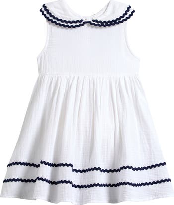Put a nautical spin on your tiny trendsetter's wardrobe with this sailor-inspired sundress cut from fresh, airy cotton gauze and traced with contrasting scallops. A Peter Pan collar puts an adorable finish on the look.