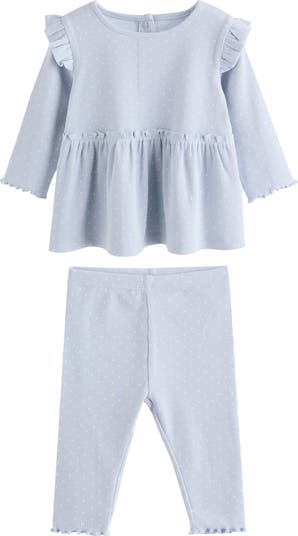 Allover ribbing and ruffle trims add charming dimension to the shirt and leggings in a coordinating set that has your budding fashionista looking adorable while feeling comfortable throughout the day.