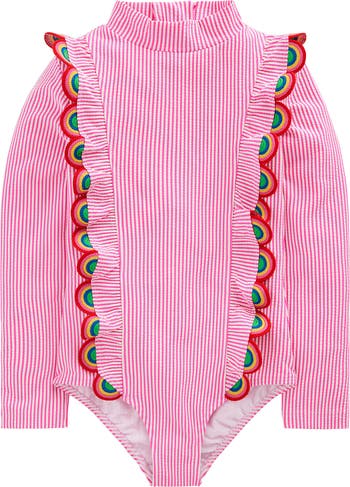 Bring an air of playfulness to their next pool day with this one-piece swimsuit featuring colorful ruffles that really stand out. The long-sleeves keep them effortlessly protected from the sun, sand and surf.