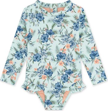 They'll love to splash and play in this sun-protected one-piece swimsuit framed by long sleeves that offer protection from the sand and surf.