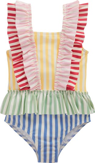 Fluttery ruffles trim this one-piece swimsuit that brings imagination and playfulness to their next pool day with its colorful stripe pattern.