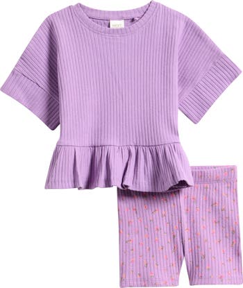 A cute, frilly top in cotton-blend ribbing pairs with shorts painted in floral sprigs on this stretchy set that's perfect for play.
