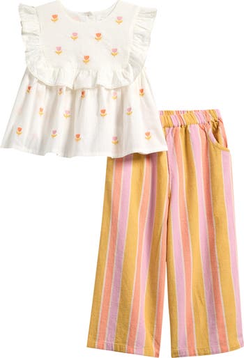Bring a retro '70s vibe to your young trendsetter's wardrobe with this groovy set featuring a pair of striped wide-leg pants and a coordinating babydoll top detailed with embroidered flowers and sweet ruffle trim.