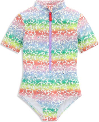 Let them splash and play in this colorful flower-striped swimsuit made with a sporty front zip.