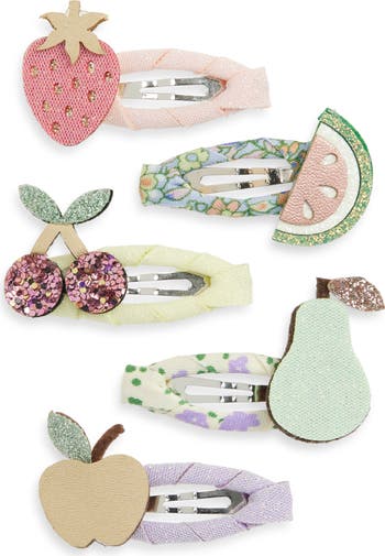 Put the perfect finishing touch on your tiny trendsetter's ensembles with this fruit salad-themed set of miniature hair clips in a variety of colors and designs.