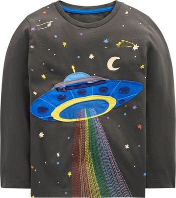 Elevate your child's look with an out-of-this-world T-shirt adorned with colorful embroidery and a playful spaceship appliqué at the front. A zippered pocket details the spaceship and houses a little green friend.