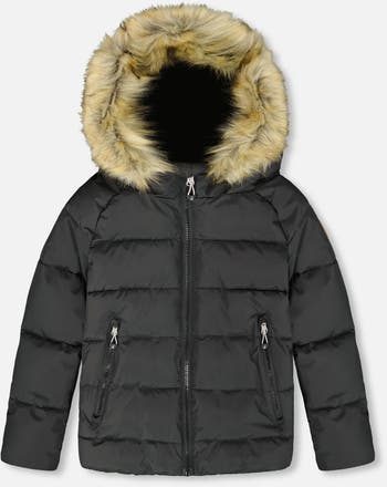 Designed for functionality and breathability, this horizontal quilted puffy coat will keep little ones warm in temperatures as low as -30°C (-22°F). Detailed with a chin guard, wind flap, and snow guard around the hood, this jacket is coated with a 3,000mm polyurethane layer for waterproofing, making it ideal for wearing in rainy and snowy conditions. A fleece lining and removable faux fur trim around the hood offer added warmth.