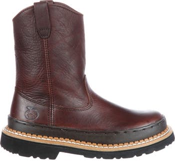 The Georgia Kids' Little Georgia Giant Wellington Boots are designed for comfort and durability. Your child will like the soggy brown color and comfort.Comfort is key for kids, which is why the children's boots are made with a high-performance lining, making it difficult to rip the inside of the boots. Covered side seams mean the seams won't rub against your child's foot, and a covered cushioned insole provides hours of comfort.The kids' pull-on boots have welt construction because kids need tough boots to ensure they won't be destroyed. The boots also have an oil-resistant rubber bumper guard to prevent abrasions on the footwear. It makes the boots stronger, and harder to fall apart. The kids' brown boots are six inches tall with a nine-inch calf circumference.For a tough kid who's on the go, there's the Georgia Kids' Boot Little Georgia Giant Wellington.