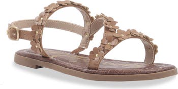 Pretty flower appliqués charm the straps of this kid-sized sandal with a flexible rubber sole for easy walking.
