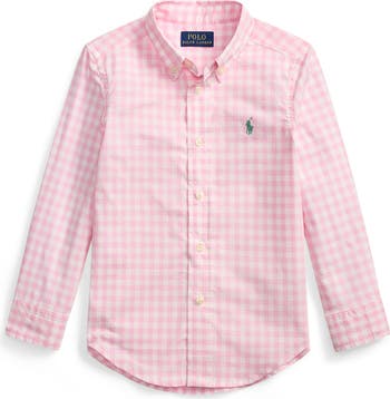 Crisp, cool cotton poplin patterned in a bright gingham check makes a special-occasion favorite of a shirt that's sized for kids and designed with a lower hem and a classic buttoned collar. It looks great smooth, rumpled, tucked or untucked to match any occasion and any child's sense of style.