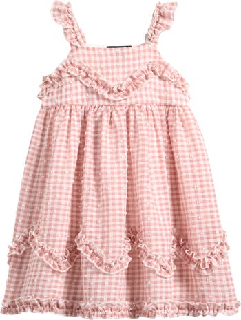 Endlessly charming (just like them), this summery frill-trimmed dress is textured with clips dots and covered in cheerful gingham checks.
