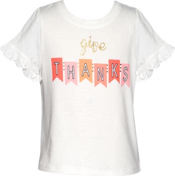 Ruffled edges define the sleeves of a soft and stretchy T-shirt fronting a colorful graphic expressing gratitude.