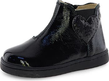 A glittery heart appliqué adds eye-catching charm to a photo-ready bootie set on a cushioned footbed and durable rubber sole.