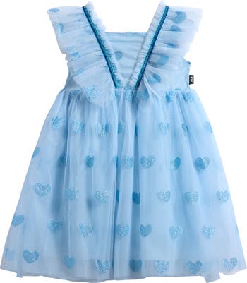 Your kiddo can have their very own royalty moment in this ruffle-embellished dress made from icy-blue tulle patterned in glittery hearts.