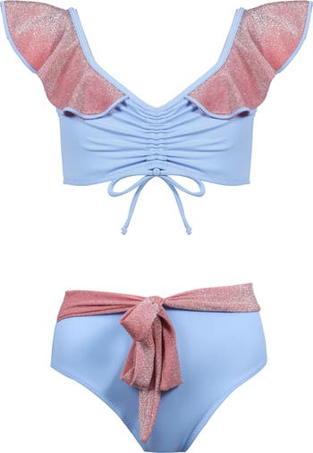 Soft pastels meet subtle sparkle in this dreamy bikini set. The ruched front and flutter ruffle sleeves add a feminine touch, while the shimmering rose-pink accents bring a hint of glamour. Designed with a flattering high-waist bottom and a glitter tie detail, this set blends elegance, comfort, and confidence for a truly radiant beach look.