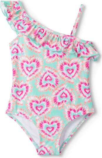 They'll love to run along the shore in this ruffle-trimmed one-piece swimsuit featuring tie-dye hearts.