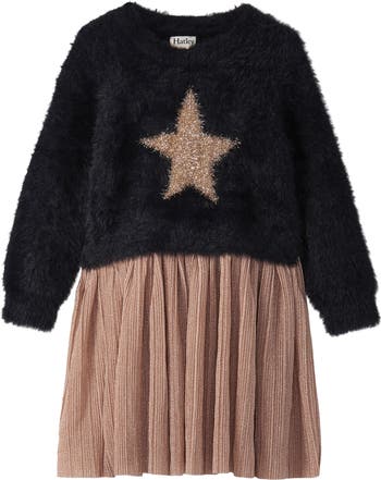 Metallic shimmer enhances the enchantment of this mixed-media dress made with a fuzzy-textured sweater bodice.