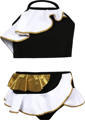 Make a statement in this striking black and white bikini set with golden ruffle accents. The high-neck silhouette and layered flounce design add a refined yet playful charm