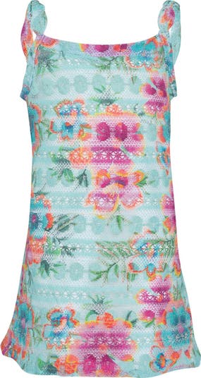 Crochet-inspired lace brings a boho vibe to this carefree sundress topped with adjustable tie straps that give your youngster a perfect fit.