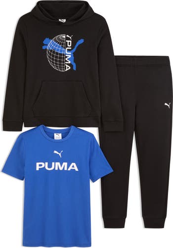 Your sporty kid can relax and play in the comfort of this logo-stamped set that includes a hoodie, graphic T-shirt and coordinating joggers.