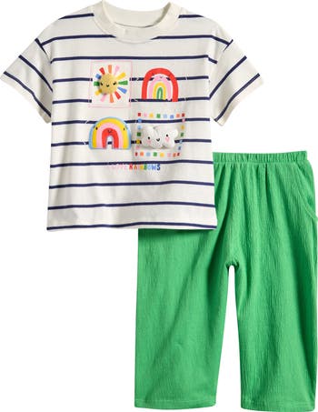 This set is basically a wearable giggle: bold stripes, playful appliqués and crinkled cotton-blend pants that don’t mind a little running around.
