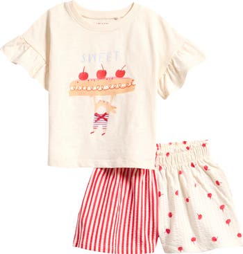 Cherries, ruffles and stripes sweeten this pint-sized set that pairs a frilly graphic T-shirt with coordinating seersucker shorts.