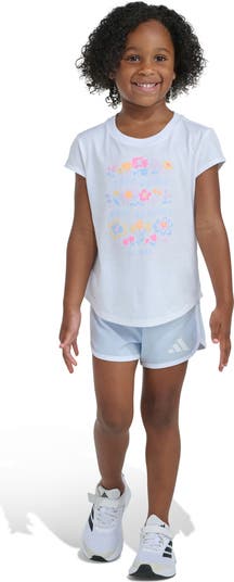 Neon-accented flowers front this supercute cotton T-shirt paired with sporty shorts.